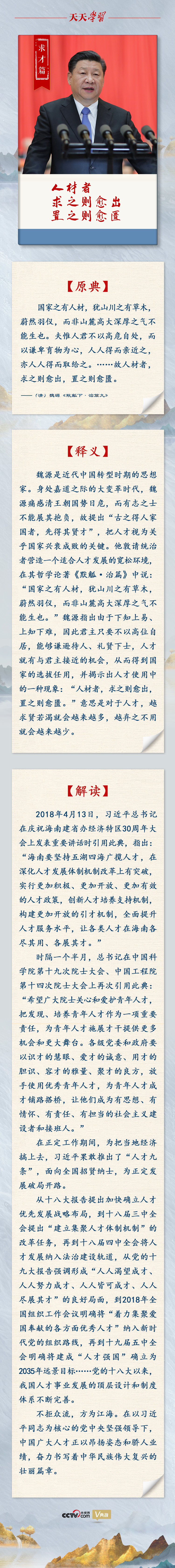 編者按:中央人才工作會(huì)議9月27日至28日在北京召開,習(xí)近平總書記出席會(huì)議并發(fā)表重要講話。黨的十八大以來,總書記站在黨和國家事業(yè)發(fā)展全局的戰(zhàn)略高度,對我國人才事業(yè)發(fā)展作出一系列重要指示。在講話和文章中,他大量引用有關(guān)中國古代人才思想的典故,就如何選才、敬才、求才、育才、用才等話題,提出了一系列新思想、新觀點(diǎn)、新論斷、新要求,為新時(shí)代做好人才工作提供了根本遵循和行動(dòng)指南!短焯鞂W(xué)習(xí)》帶您一起學(xué)習(xí)回顧。