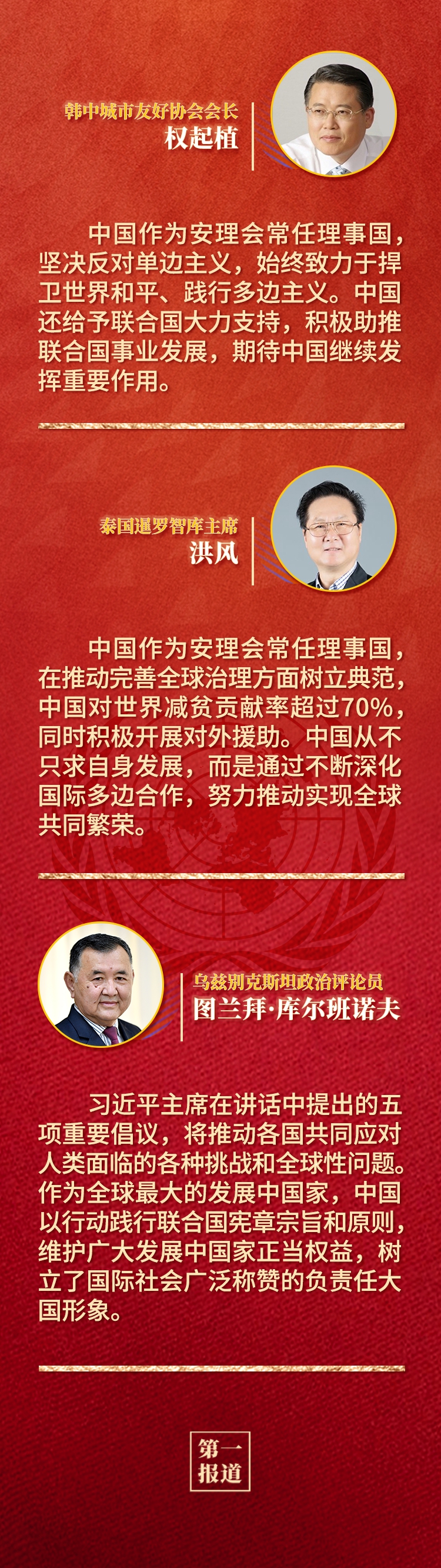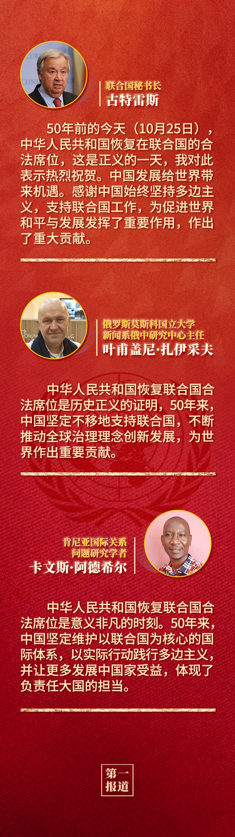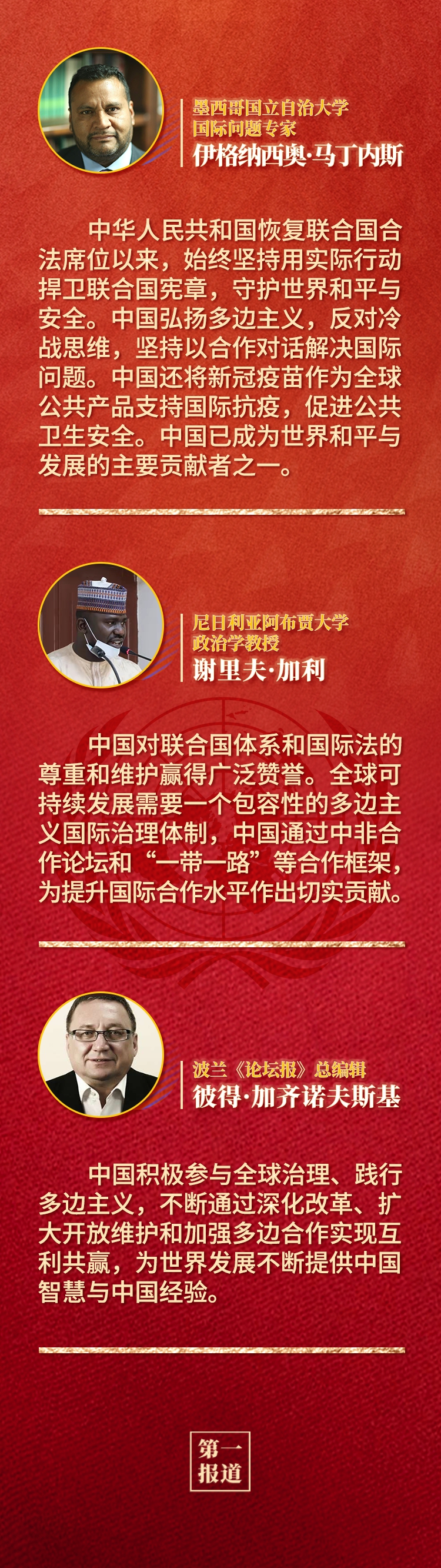 多國(guó)人士認(rèn)為,中華人民共和國(guó)恢復(fù)聯(lián)合國(guó)合法席位是世界和聯(lián)合國(guó)歷史上的一個(gè)大事件,習(xí)近平主席的重要講話(huà)回顧了中國(guó)和平發(fā)展、造福人類(lèi)的50年,為實(shí)現(xiàn)世界永續(xù)和平發(fā)展提出重要倡議,為全球共同推動(dòng)構(gòu)建人類(lèi)命運(yùn)共同體注入新的強(qiáng)大動(dòng)力。