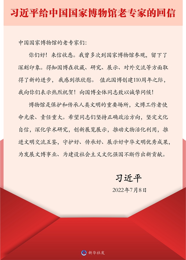 你們好!來信收悉。我曾多次到國家博物館參觀,留下了深刻印象。得知國博在收藏、研究、展示、對(duì)外交流等方面取得了新的進(jìn)步,我感到很欣慰。值此國博創(chuàng)建110周年之際,我向你們表示熱烈祝賀!向國博全體同志致以誠摯問候!