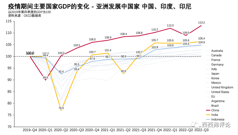 印度作為后起的發(fā)展中國家,在疫情前,經(jīng)濟(jì)增速已經(jīng)超過中國。但疫情這三年,中國擴(kuò)大了和印度之間的差距。中國2022年三季度,GDP是2019年四季度的113.2%,印度則只是106.4%。