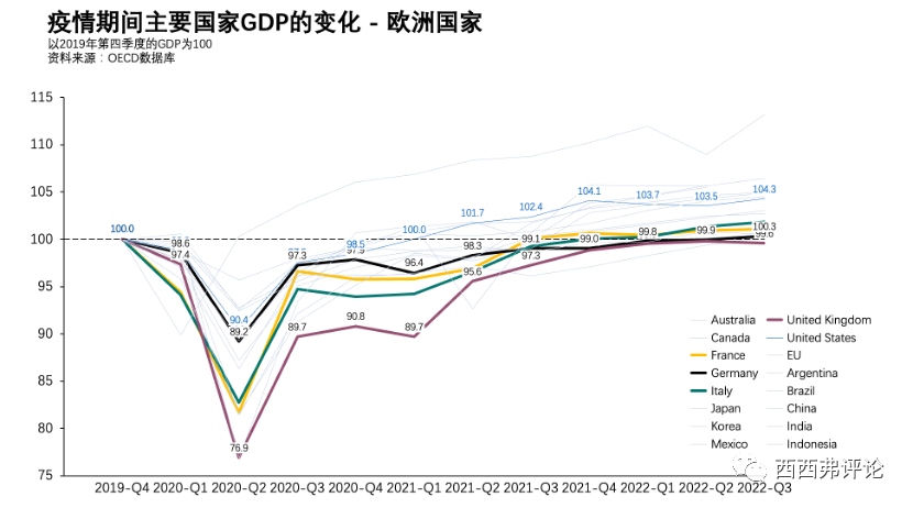 英法德意四個(gè)歐洲國家,從2019年四季度到2022年三季度,經(jīng)濟(jì)基本上原地踏步。