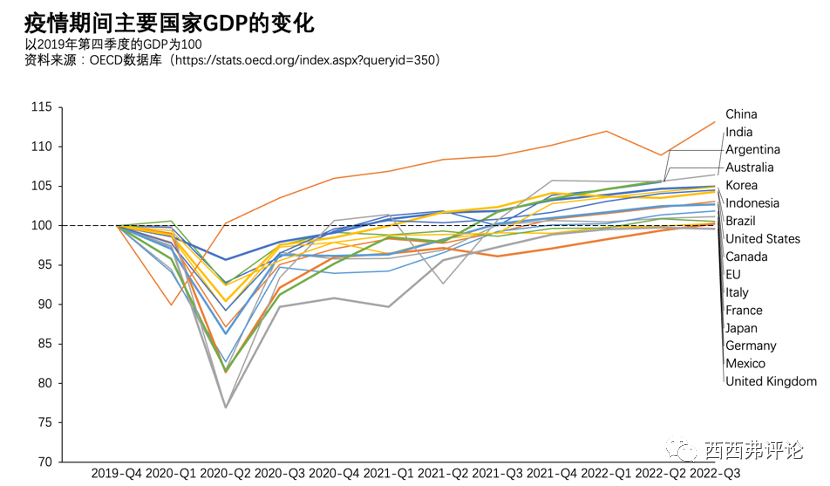 所以,看各國經(jīng)濟(jì),得以疫情前的數(shù)據(jù)作為基準(zhǔn)。最近OECD數(shù)據(jù)庫更新了主要國家今年三季度的GDP增長數(shù)據(jù),印度的三季度數(shù)字也出來了。我根據(jù)這個(gè),更新了一下最新的各國GDP,以2019年第四季度的GDP為100。
