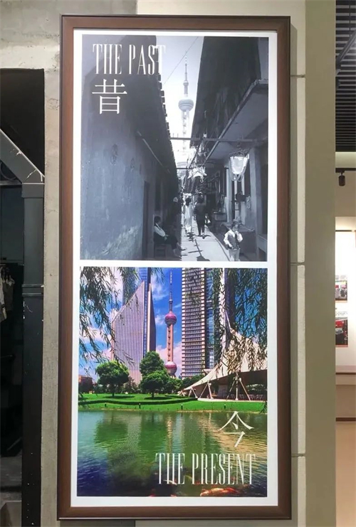 △展廳內(nèi),同一視角上海今昔對比圖。上面一張“爛泥渡路”照片,拍攝于1995年左右,下面一張照片則攝于近年,滿目高樓林立、綠草如茵。