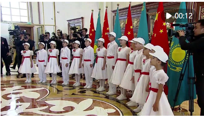 十余名哈薩克斯坦少年兒童用中文演唱《歌唱祖國》,熱烈歡迎習近平主席到訪。