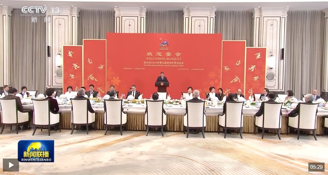 2月7日中午,國家主席習(xí)近平和夫人彭麗媛在黑龍江省哈爾濱市太陽島賓館舉行宴會(huì),歡迎來華出席哈爾濱第九屆亞洲冬季運(yùn)動(dòng)會(huì)開幕式的國際貴賓。