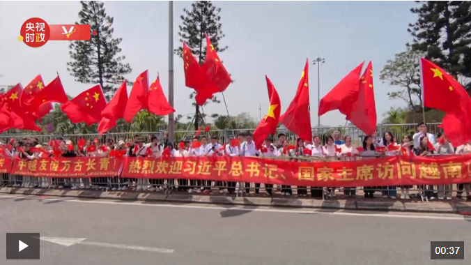 習(xí)近平乘車從機(jī)場(chǎng)赴下榻飯店途中,中越兩黨兩國(guó)旗幟迎風(fēng)飄揚(yáng),“中越友誼萬(wàn)古長(zhǎng)青”、“山水相連,命運(yùn)與共”、“中越情誼深,同志加兄弟”等紅色橫幅鮮艷奪目。當(dāng)?shù)孛癖姾椭匈Y機(jī)構(gòu)、留學(xué)生代表聚集在道路兩旁,熱烈歡迎習(xí)近平到訪。