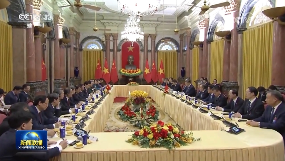 4月15日上午,中共中央總書記、國(guó)家主席習(xí)近平在河內(nèi)主席府會(huì)見(jiàn)越南國(guó)家主席梁強(qiáng)。