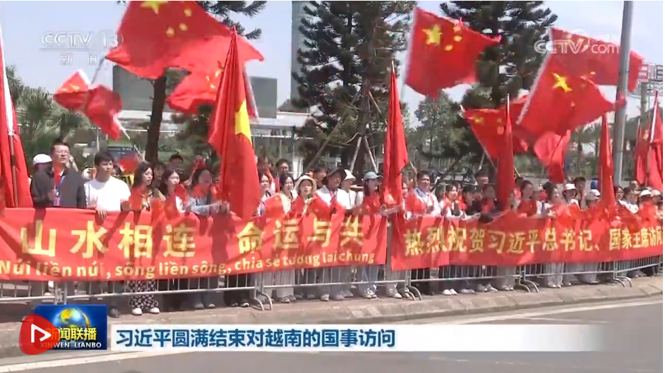 離開(kāi)河內(nèi)時(shí),越南總理范明政,越共中央政治局委員、中央書(shū)記處常務(wù)書(shū)記陳錦繡,越共中央書(shū)記處書(shū)記、中央辦公廳主任黎懷忠等越南黨政領(lǐng)導(dǎo)人和地方代表到機(jī)場(chǎng)送行。當(dāng)?shù)孛癖姾椭匈Y機(jī)構(gòu)、留學(xué)生代表高舉紅色橫幅,熱烈祝賀習(xí)近平訪問(wèn)越南取得圓滿成功。