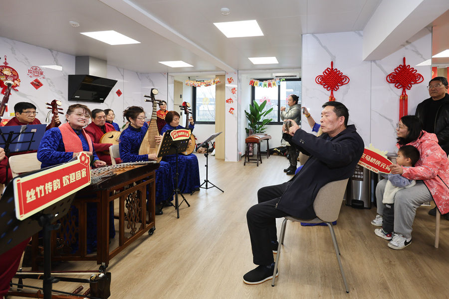民樂隊在上海市閔行區(qū)新時代城市建設(shè)者管理者之家演奏(2024年2月23日攝)。新華社記者王翔 攝