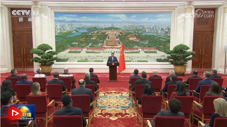 儀式結(jié)束后,習(xí)近平在北京廳對使節(jié)們發(fā)表講話。
