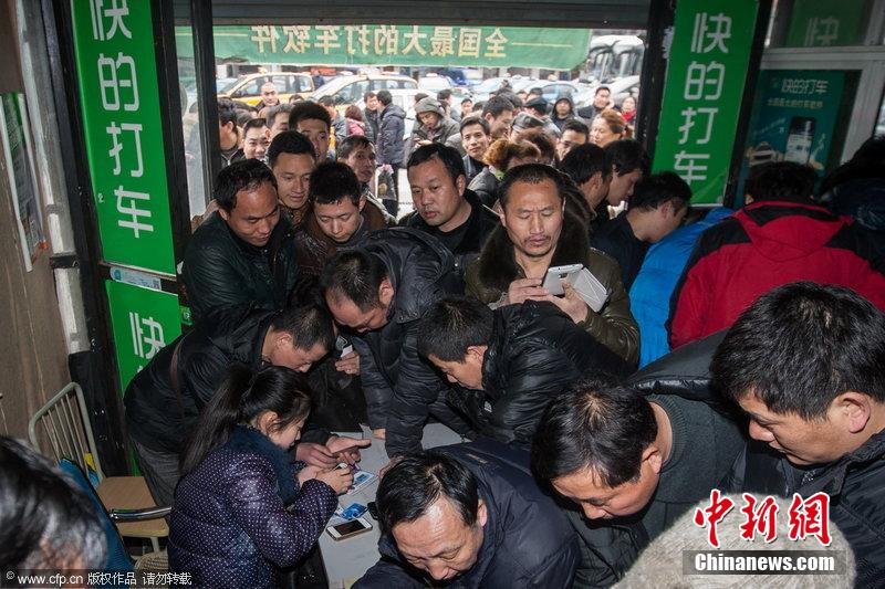 2014年2月19日,杭州“快的打車”服務(wù)點(diǎn),出租車司機(jī)們排隊(duì)安裝軟件。圖片來源:CFP視覺中國