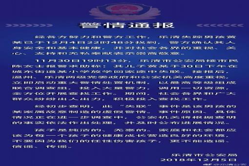 浙江省樂清市公安局官方微博5日凌晨發(fā)布警情通報稱,經各方努力和警方工作,樂清失蹤男孩黃某已于12月4日22時48分找到,警方確認其人身安全和基本健康,并對社會……