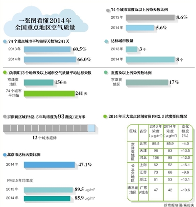 新京報訊 (記者金煜) 環(huán)保部昨日公布了去年重點(diǎn)區(qū)域和74個城市空氣質(zhì)量狀況。去年全國PM2.5濃度有了普遍下降,京津冀區(qū)域PM2.5年均濃度降到93微克/立方米,雖然……