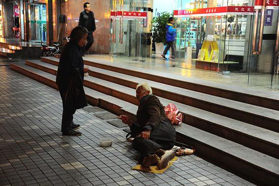 2013年11月4日,蘇州某地街頭,乞討人員在新華書店前“交流”心得。 東方IC 圖職業(yè)乞討人員每天的收入大約能有四五百元,每月的收入起碼過萬;救助站工作人員甚至……