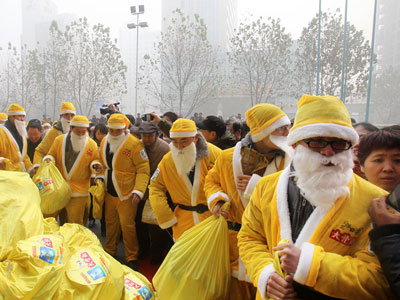 2013年12月24日,江蘇省南通市,游客們身穿圣誕老人的服裝用光電筆寫下2014。圖片作者:徐培欽/CFP2013年12月24日,鄭州市。圣誕老人們著黃裝開送禮動(dòng)員大會(huì)。200……