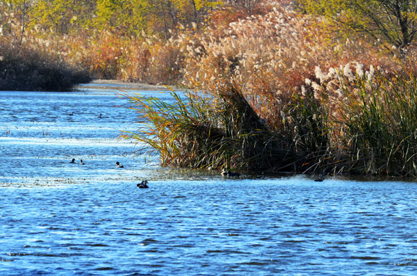 水鳥在濕地覓食、游弋(11月17日攝)。初冬時(shí)節(jié),山東省萊西市姜山濕地碧波蕩漾,成片蘆葦隨風(fēng)搖曳,數(shù)以千計(jì)的鳥兒在蘆葦叢中棲息、飛翔。該濕地總面積達(dá)2萬(wàn)畝,……