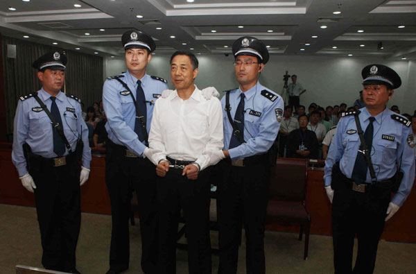 9月22日,薄熙來案件在濟(jì)南中院宣判。圖為宣判結(jié)束后,薄熙來被帶上手銬。