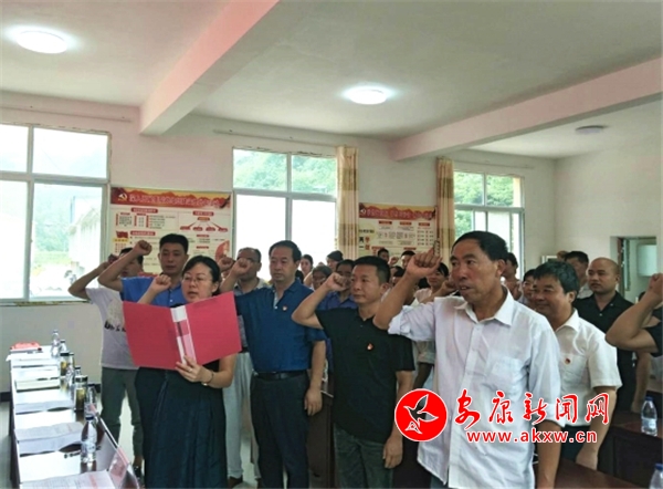 “我志愿加入中國共產(chǎn)黨,擁護(hù)黨的綱領(lǐng),遵守黨的章程……”7月17日,在老莊溝村二樓會(huì)議室里,來自市中心血站的20多名黨員干部與老莊溝村全體黨員統(tǒng)一佩戴黨徽,整齊列隊(duì),舉起右手,在黨旗下莊嚴(yán)宣誓,重溫入黨誓詞。