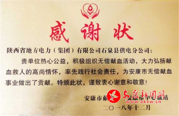 幾年來,石泉縣供電分公司無償獻血活動,得到上級組織的從分肯定。 2016年石泉縣供電分公司受到邀請,參加了紀念“6.14”世界獻血者日,安康市人民政府舉辦的全市無償獻血促進會,作了無償獻血工作經(jīng)驗交流發(fā)言,作為全市唯一的企業(yè)代表,電力人深感自豪和光榮;同年被安康市無償獻血領(lǐng)導(dǎo)小組辦公室、安康市紅十字會、安康市衛(wèi)生和計劃生育局聯(lián)合授予“安康市無償獻血愛心合作單位”,成為石泉縣第一家被授予無償獻血愛心合作的單位;2017年榮獲“市級無償獻血工作促進獎先進集體”;2018年12月安康市、安康市中心血站送來“感謝狀”這一系列成績的取得為石泉縣供電分公司省級精神文明標兵單位增色添彩,同時石泉縣供電分公司也是全縣僅此一家“省級精神文明標兵單位”保持者,公司更高的目標是創(chuàng)建“全國精神文明單位”這是幾代石泉電力人的夢想。