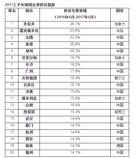 該報告中的房價變化對比的是2017年6月與2016年6月這12個月以來的數據。除了無錫排在全球第3位以外,香港排在第4位,鄭州排在第5位,長沙排在第7位,廣州第8位,石家莊第10位,濟南第11位,合肥第13位,武漢第15位,廈門第16位,杭州第17位,西安排在第18位。