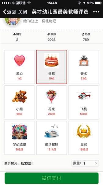 “幼兒園網(wǎng)絡投票評選最美老師,竟然還可以買禮物代替投票,這算不算變相讓家長花錢給老師?”豐禾小區(qū)英才幼兒園評選最美老師活動引發(fā)爭議,有家長如是說。投票者可送出的禮物從1點愛心到1888點的皇冠不等,其中1點就是1元。
