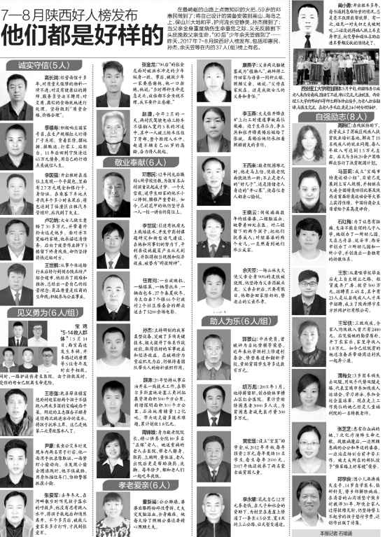 在最崎嶇的山路上點(diǎn)燃知識(shí)的火把,59歲的鄧惠民做到了;將自己設(shè)計(jì)的裝備安裝到高山、海島之上,保山川大地和平,護(hù)河流長(zhǎng)空靜美,孫杰做到了;當(dāng)父親全身重度燒傷生命垂危之際,義無(wú)反顧割下頭皮挽救父親生命,“90后”少年余天笠做到了……昨天,2017年7-8月陜西好人榜發(fā)布,包括鄧惠民、孫杰、余天笠等在內(nèi)的37人(組)榜上有名。8AD安康新聞網(wǎng)
