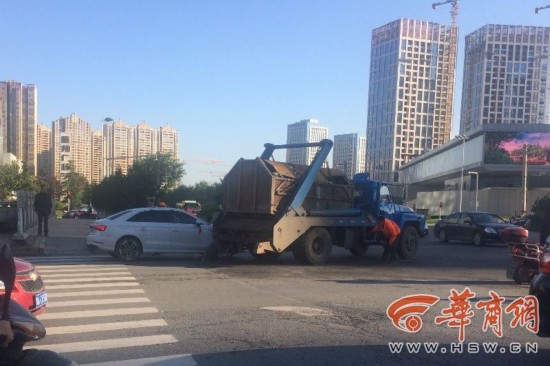 雁翔橋上實習(xí)奧迪車撞上環(huán)衛(wèi)車 兩司機(jī)無礙