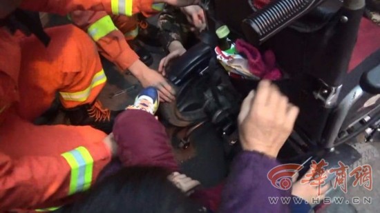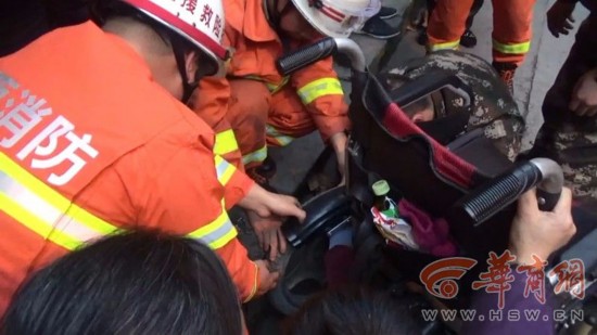 由于這輛輪椅是電動(dòng)輪椅,小孩的腳就夾在輪椅的擋泥板和輪胎中間,要把小孩的腳取出來(lái)就得啟動(dòng)電源,這樣更容易給小孩造成更大的傷害,消防人員只能一邊安撫小孩的情緒,一邊想辦法利用工具拆卸電動(dòng)輪椅,將擋泥板和輪子分離開來(lái)。