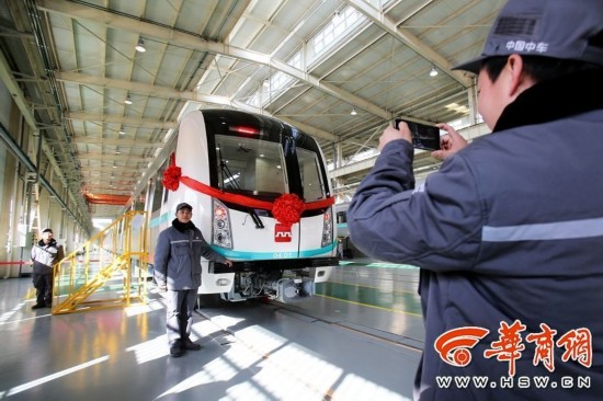 12月20日,西安中車長客公司,西安地鐵四號線首列車到達(dá)西安并交付,工作人員與地鐵四號線首列車合影留念。本組圖片由華商報記者 黃利健 攝