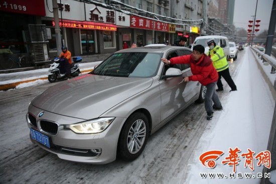 1月4日在西安市咸寧路上,雪后路面太滑,紅燈停下后,寶馬車打滑都無法起步。 華商記者 鄧小衛(wèi) 攝影報(bào)道