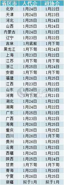 | 注:資料來(lái)源于各省日?qǐng)?bào),人大、政協(xié)網(wǎng)站或當(dāng)?shù)匦麄鞑块T(mén),內(nèi)容截至1月5日,實(shí)際時(shí)間以當(dāng)?shù)貢?huì)議召開(kāi)時(shí)間為準(zhǔn)。 |