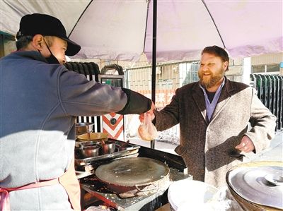 每天上午,只要有時間,他都會準時來到西安外國語大學雁塔校區(qū)北門外,買一份煎餅果子當早餐。煎餅攤的張老板和他是“老熟人”了!拔业闹形娜窃陲堭^點餐時練習出來的,比如‘泡饃’‘biangbiang面’‘肉夾饃’,全是我的最愛!奔s翰開玩笑地說,西安人的學習熱情很高,知道他來自美國后,通常會跟他練習英語口語,沒人找他聊中文。因此,他的中文水平至今也沒能提高多少!拔业母改、朋友來西安時,我可是他們的美食導游。哪家羊肉泡饃好吃,我都清楚!奔s翰笑稱自己已經(jīng)養(yǎng)成了“陜西胃”,特別愛吃西安的各類美食。