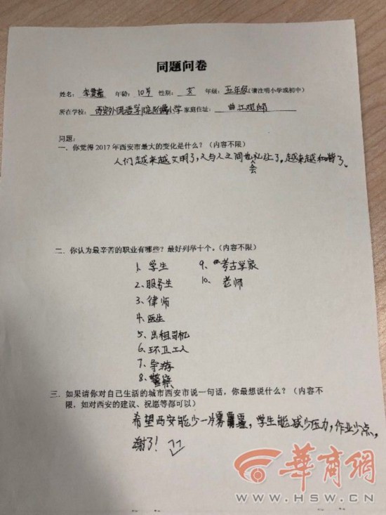11歲的王慧倩在碑林區(qū)建國路小學(xué)上學(xué),她寫下環(huán)衛(wèi)工人、醫(yī)生,為啥呢?“環(huán)衛(wèi)工人每天起得很早,回得很晚,地上有垃圾他們就得收拾!彼f,醫(yī)生每天都要給病人看病,“很晚的時(shí)候,大家都睡覺了,要去找醫(yī)生,醫(yī)生不睡覺要給病人治病!