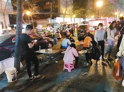 4月1日晚8時(shí)許,記者來到交大街,蘭蒂斯城小區(qū)門前熱鬧不已。麻辣燙、砂鍋、炒面、餃子、餛飩、米線、臭豆腐……各種小吃應(yīng)有盡有,近20個(gè)小攤販把小區(qū)門前的人行道包圍得水泄不通。每個(gè)小吃攤都有不少食客,生意紅火的同時(shí),地面上卻是一片狼藉。