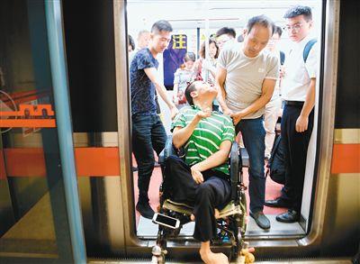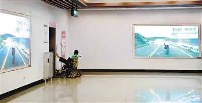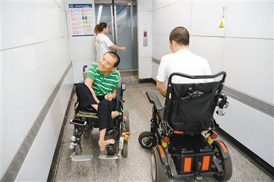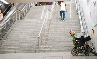 他將電動輪椅開到無障礙設(shè)施處,用腳按下求助按鈕。