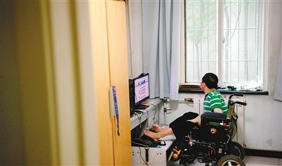 朱思文在電腦旁用腳敲擊鍵盤上網(wǎng)
