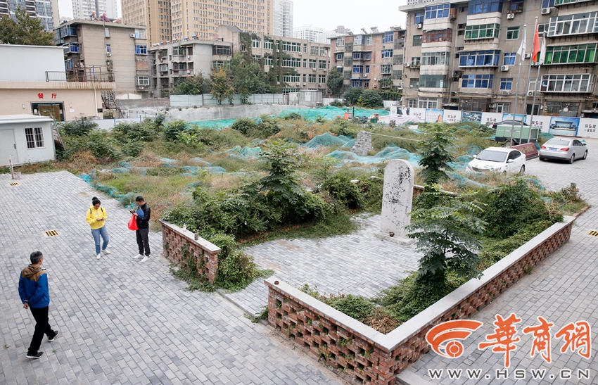 10月19日下午,記者隨馮沖及其父親、叔叔來(lái)到陜西省交通醫(yī)院院內(nèi)。院子當(dāng)中是塊空地,中間有一塊園林,古墓位于園林中間。緊挨著古墓的一側(cè),是一個(gè)大坑,“這是醫(yī)院蓋樓打的地基坑!瘪T沖說(shuō)。