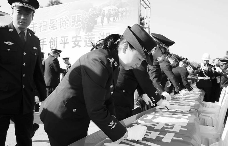 活動(dòng)現(xiàn)場(chǎng),公安蓮湖分局副局長(zhǎng)張根勤致辭,分局各部門設(shè)立宣傳臺(tái),結(jié)合自身工作了開展有聲有色的宣傳活動(dòng)。分局政工科、巡特警大隊(duì)、刑偵大隊(duì)、掃黑辦、治安大隊(duì)、及分局13個(gè)派出所民警代表在“掃黑除惡”“平安創(chuàng)建”宣傳點(diǎn)上展示風(fēng)采,通過介紹宣傳展板、發(fā)放宣傳彩頁、解答業(yè)務(wù)問題的方式向現(xiàn)場(chǎng)市民宣講“掃黑除惡”和“平安創(chuàng)建”知識(shí)。分局副局長(zhǎng)杜保華帶領(lǐng)民警進(jìn)行集體宣誓,并和民警及志愿者在寓意著全民同心、共同除惡的“有黑掃黑、有惡除惡、無惡治亂”宣傳橫幅上簽名。
