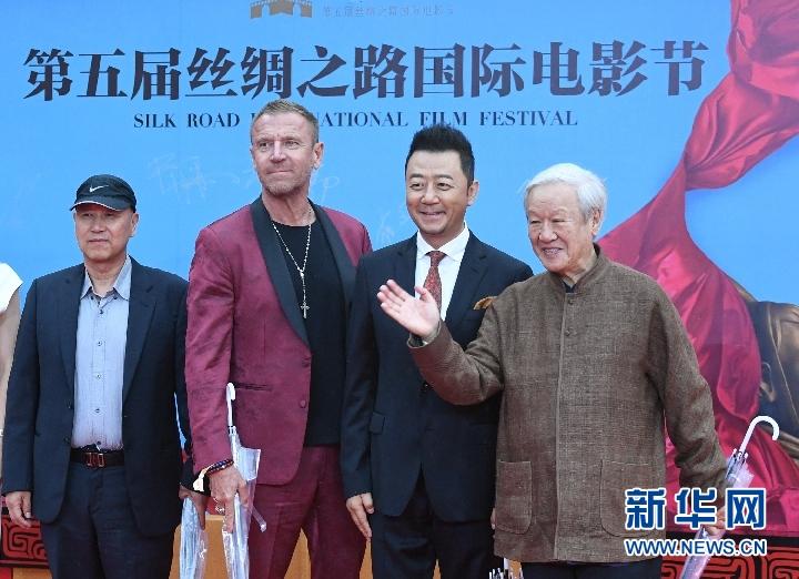 10月13日,第五屆絲綢之路國(guó)際電影節(jié)評(píng)委會(huì)成員謝飛、郭濤、雷尼·哈林、霍廷霄(從右至左)亮相紅毯。新華社記者 張博文 攝