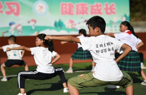 7月9日,在陜西省安康市平利縣老縣鎮(zhèn)中心小學(xué)的操場(chǎng)上,學(xué)生們?cè)谡n后參加武術(shù)社團(tuán)活動(dòng)。新華社記者李一博 攝
