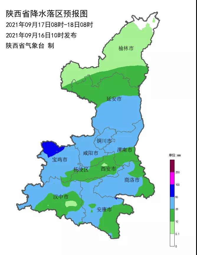陜北南部、關(guān)中50~100毫米,局地可達(dá)120~140毫米。