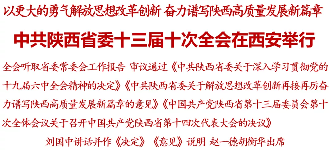 全會以習近平新時代中國特色社會主義思想為指導,全面貫徹黨的十九大和十九屆二中、三中、四中、五中、六中全會精神,深入學習貫徹習近平總書記“七一”重要講話和來陜考察重要講話重要指示,審議通過《中共陜西省委關于深入學習貫徹黨的十九屆六中全會精神的決定》、《中共陜西省委關于解放思想改革創(chuàng)新再接再厲奮力譜寫陜西高質量發(fā)展新篇章的意見》和《中國共產黨陜西省第十三屆委員會第十次全體會議關于召開中國共產黨陜西省第十四次代表大會的決議》,總結今年工作,部署明年任務,達到了統(tǒng)一思想、凝心聚力、明確目標、鼓勁加油的目的。