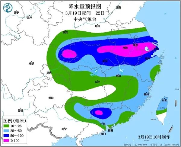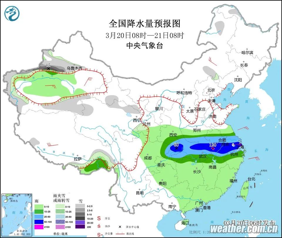 預(yù)計(jì),3月20日08時(shí)至21日08時(shí),四川盆地東北部、陜西東南部、湖北、河南南部、安徽中南部、江蘇南部、上海、浙江北部等地有大雨,其中,重慶北部、陜西東南部、湖北北部和東部、河南東南部、安徽中部和西南部、江蘇南部、上海、浙江北部等地部分地區(qū)有暴雨,局地有大暴雨(100~120毫米),上述部分地區(qū)伴有短時(shí)強(qiáng)降水(最大小時(shí)降雨量20~40毫米,局地可超過50毫米),局地有雷暴大風(fēng)或冰雹等強(qiáng)對流天氣。