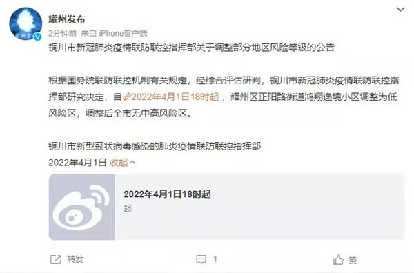 根據(jù)國(guó)務(wù)院聯(lián)防聯(lián)控機(jī)制有關(guān)規(guī)定,經(jīng)綜合評(píng)估研判,銅川市新冠肺炎疫情聯(lián)防聯(lián)控指揮部研究決定,自2022年4月1日18時(shí)起 ,耀州區(qū)正陽路街道鴻翔逸境小區(qū)調(diào)整為低風(fēng)險(xiǎn)區(qū),調(diào)整后全市無中高風(fēng)險(xiǎn)區(qū)。