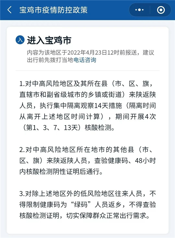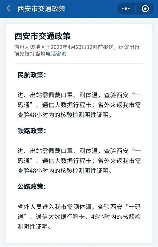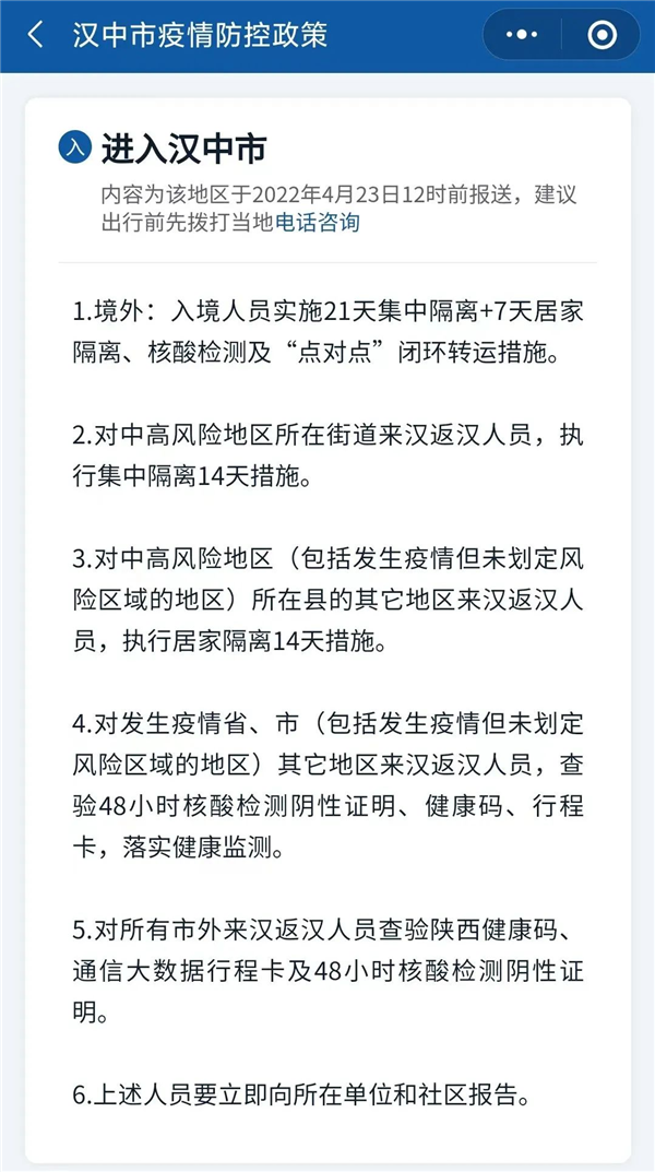 陜西省內(nèi)各市最新的疫情防控政策來(lái)了。ń刂4月23日)建議出行先撥打當(dāng)?shù)仉娫捵稍儯?/strong>M2Z安康新聞網(wǎng)