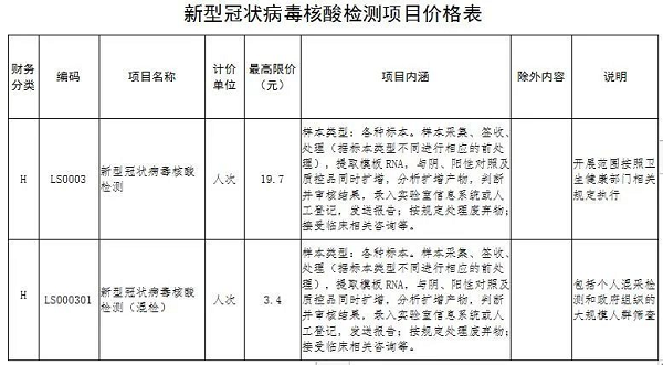 一、公立醫(yī)療機(jī)構(gòu)按照衛(wèi)生健康部門診療規(guī)范開展的新型冠狀病毒核酸檢測單人單檢價格每人次最高限價為19.7元(含擴(kuò)增試劑);多人混檢不分樣本數(shù)量,每人次最高限價為3.4元。