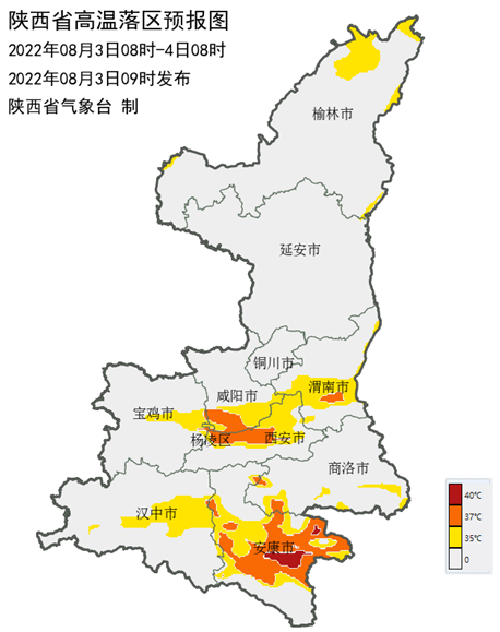 2022年8月3日10時00分,陜西省氣象臺發(fā)布高溫黃色預警 :受大陸高壓影響,3日榆林北部、關中大部、陜南大部地方有35℃以上的高溫天氣,其中咸陽南部、楊凌、西安大部、渭南南部、漢中東部、安康部分地方可達37℃以上,安康平原地區(qū)局地可達40℃以上。