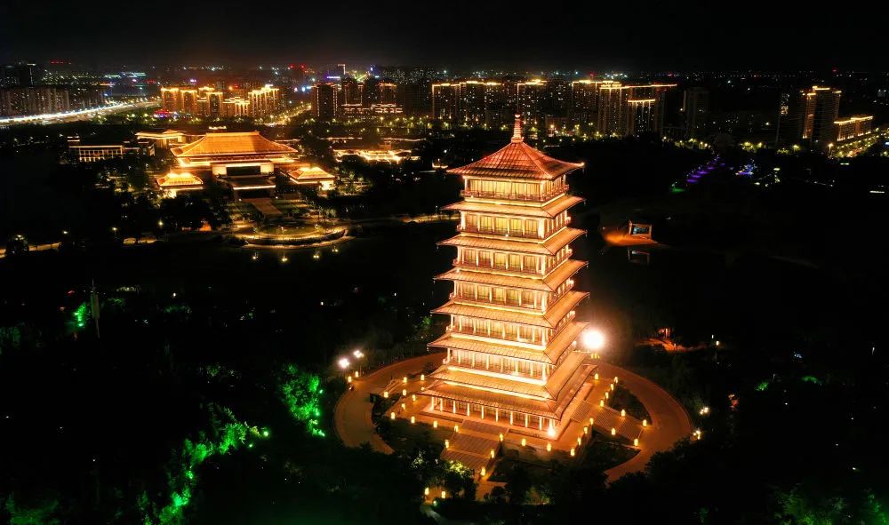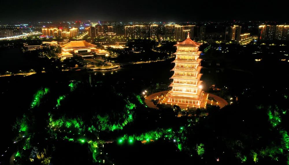 ↑西安曲江南湖夜景(4月19日攝,無人機(jī)照片)。新華社記者 劉瀟 攝