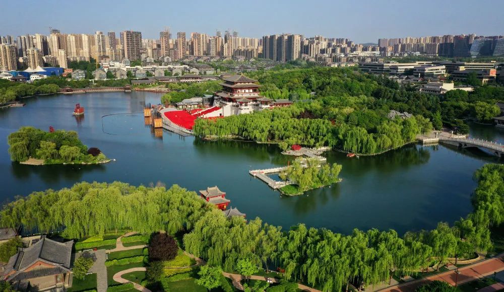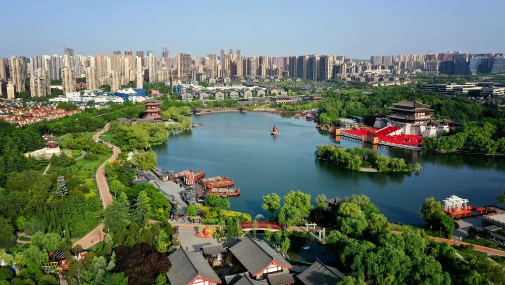 ↑西安大唐芙蓉園(4月25日攝,無人機(jī)照片)。新華社記者 劉瀟 攝