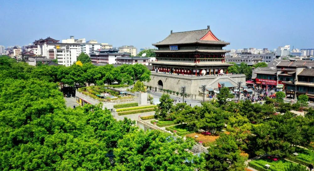 ↑西安鼓樓(4月25日攝,無人機(jī)照片)。新華社記者 劉瀟 攝
